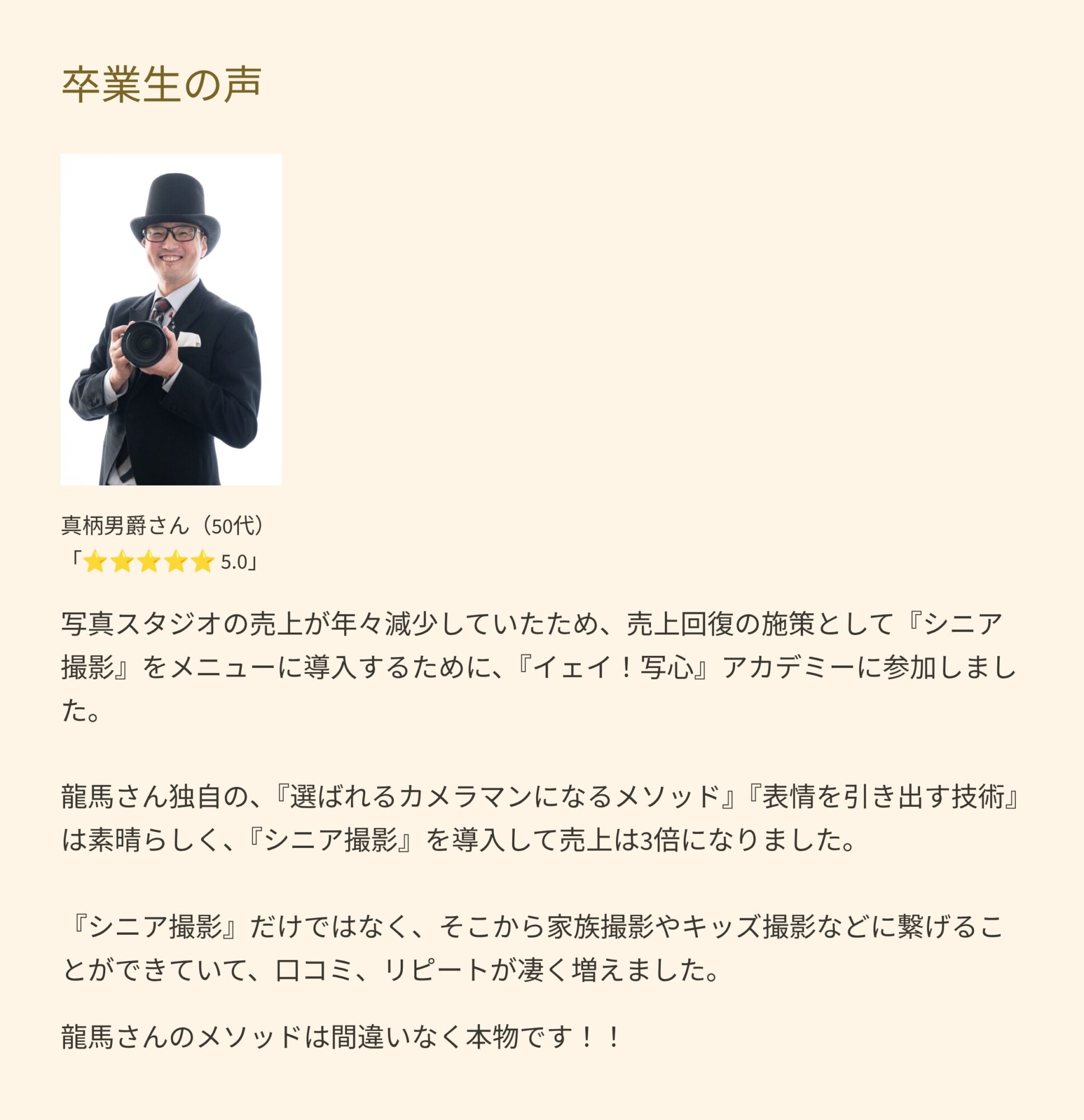 学びのプラットフォーム『ストアカ』でストアカ講師 30000人中 1位を獲得 受講者満足度 4.78(5点満点) 総受講者1万人以上 プロカメラマン養成講座卒業生400人以上の実績を残してきています。